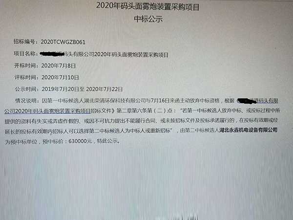 湖北永鑫機(jī)電設(shè)備有限公司《霧炮中標(biāo)公示》